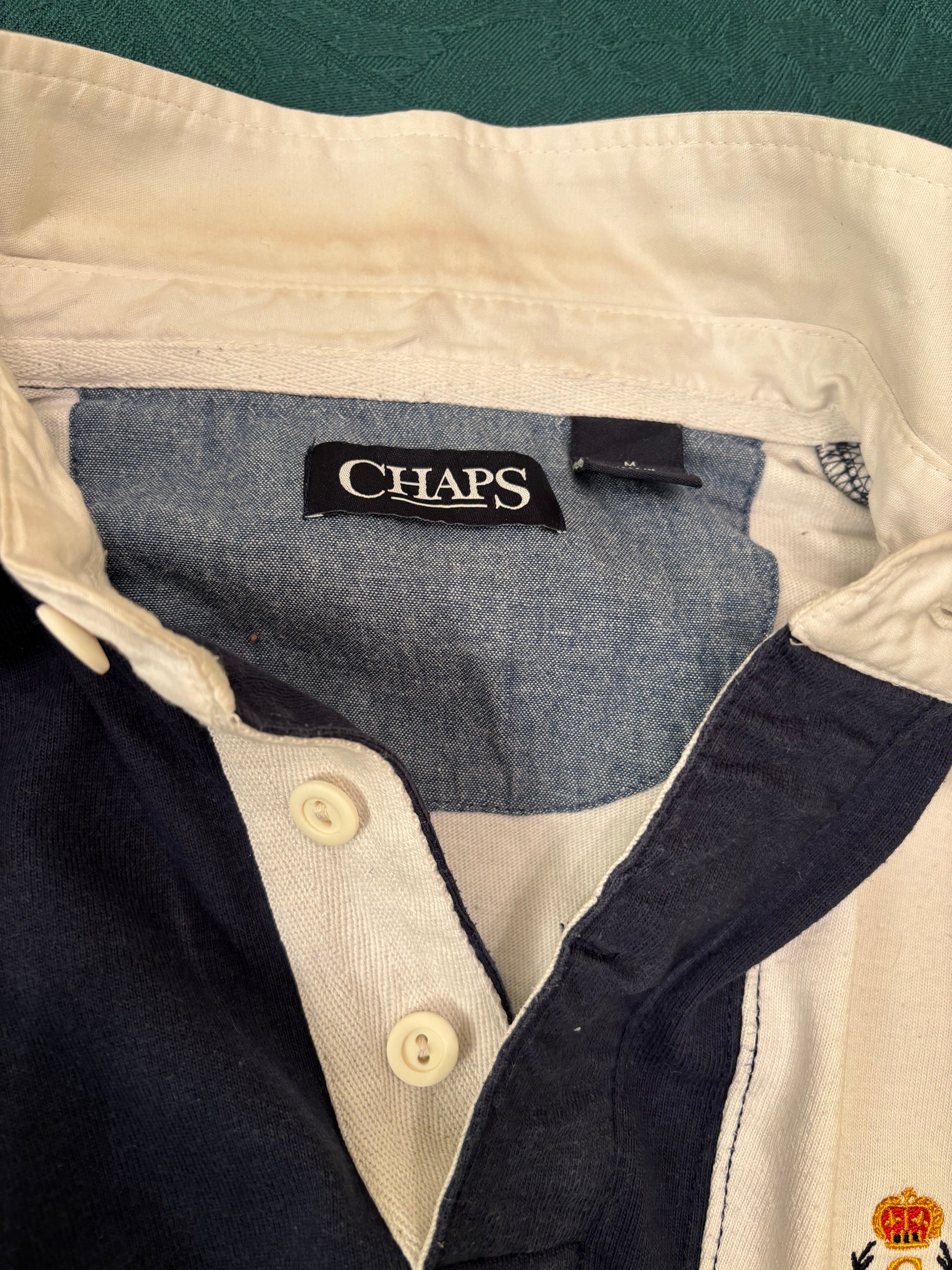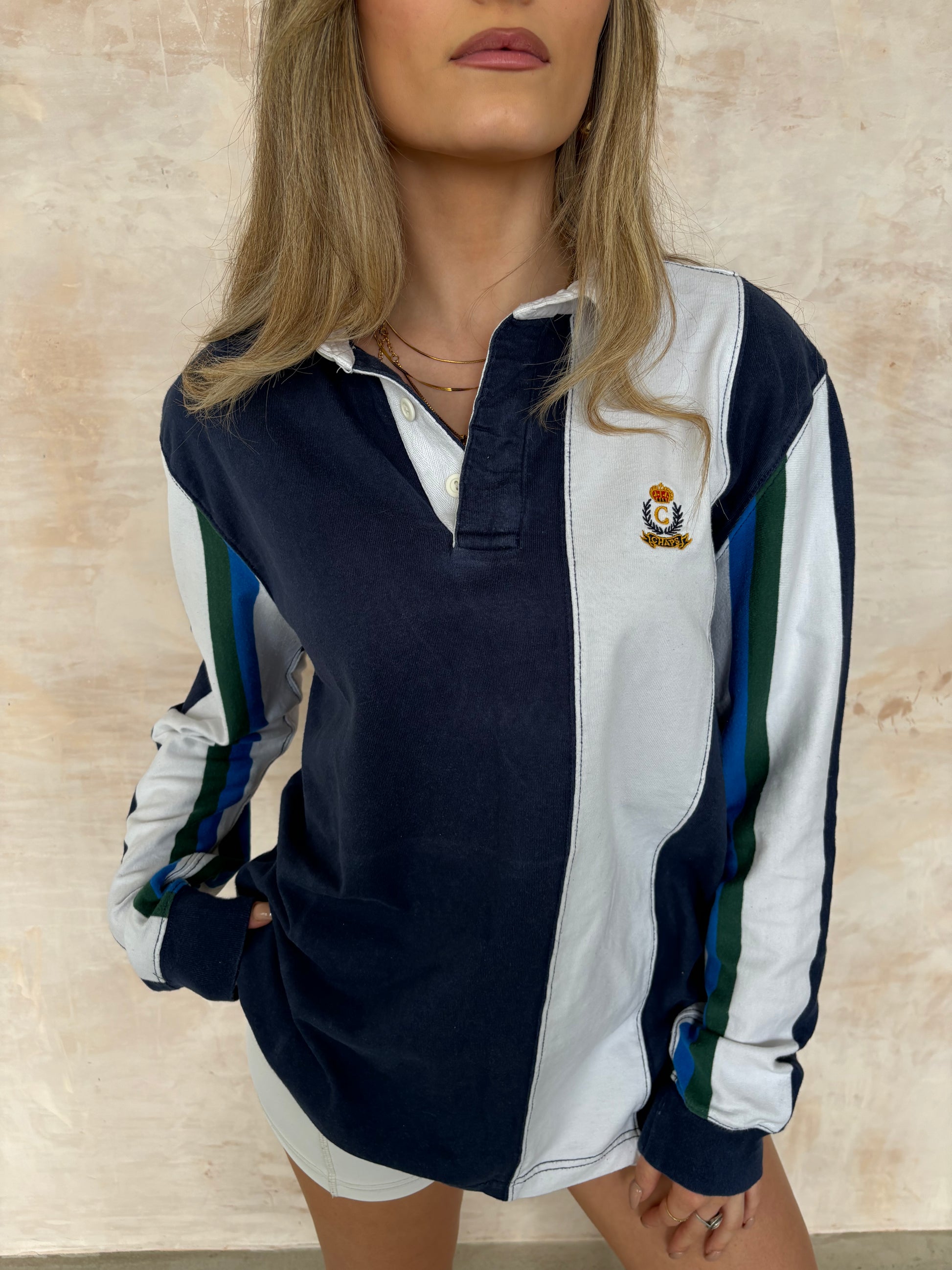 Vintage Chaps Ralph Lauren navy and white striped collared rugby top.